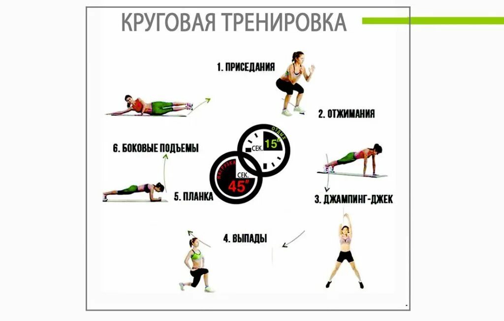 Круговая тренировка — это последовательное выполнение нескольких упражнений без пауз между ними. После прохождения всего круга делается короткий отдых, затем круг повторяется 2–4 раза. Такой формат отлично развивает выносливость, укрепляет мышцы и помогает сжигать жир.